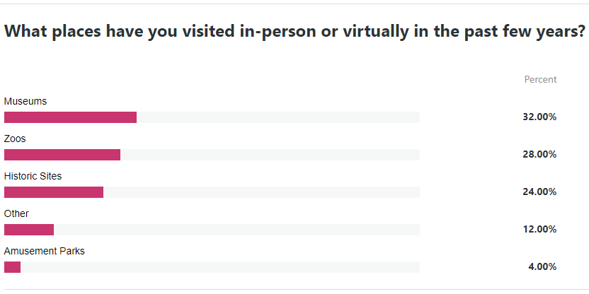 In the first poll, I wanted to learn from you what places have you been to in-person and/or virtually in the past few years to get an idea of where you all have been.