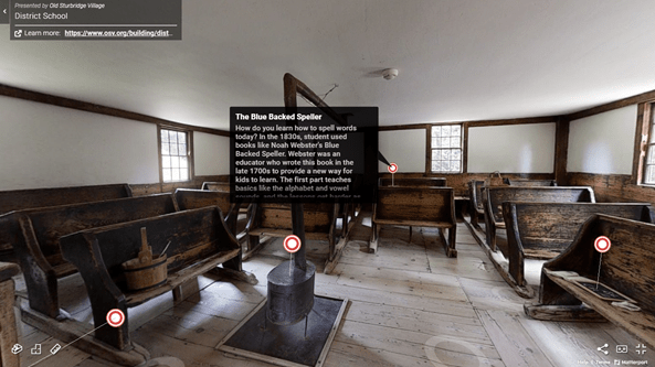 According to the website, 3D Tours are supported in part by a grant from the Webster Cultural Council, a local agency that is supported by the Mass Cultural Council, a state agency. At the time I made this visit, the following buildings were available in the virtual tour: the Asa Knight Store, the District School, the Pottery Shop, the Freeman Farm, the Sawmill, the Printing Office, and the Fenno House. To learn more about these buildings, they include brief histories of the buildings that include when and where they were built, when they moved to Old Sturbridge Village, and what they were used for. Also, the tours allow virtual visitors to get up close to artifacts that are usually behind barriers such as the catalog in the Asa Knight Store and the pottery on the shelves of the Pottery Shop. There are pins throughout the tours to look closer or learn new information, and new videos with some of the Village’s knowledgeable costumed historians to bring the spaces to life.