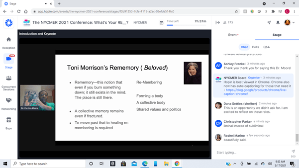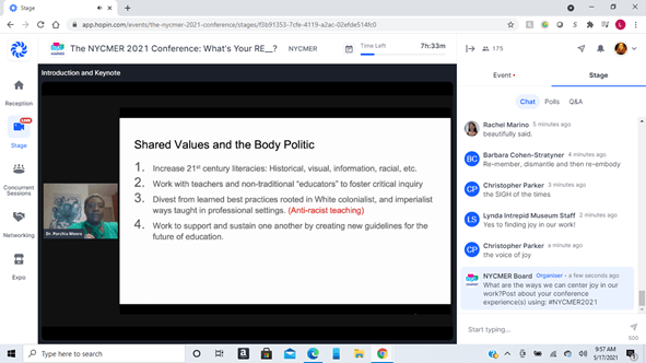 I decided to attend this year’s New York City Museum Educators Roundtable (NYCMER) virtual conference which took place on Monday, May 17th. This was their second conference on the virtual platform, and not only did I want to engage with colleagues in the field and learn from sessions on the museum education field, but I also wanted to see how the second virtual conference compares to the first virtual conference. The theme this year was Reflect, Reinterpret, Represent: What’s your Re__? and the sessions encouraged participants to reflect on the lessons we learned and reinterpret the fundamentals of both museum and informal education while we move forward towards a renewed and more representative museum field. Once again, the NYCMER conference was held on the Hopin app, and like I said in last year’s post: participants would be able to do what we usually did during the conference, including attending the keynote session, sessions, poster sessions, Peer Group meetings, and networking, but from home. Instead of releasing my thoughts last week, I wanted to focus on gathering them and my notes to give a concise account of my experiences during the conference.