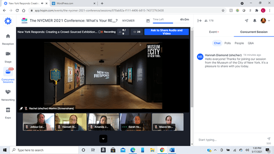 Networking with colleagues was a challenge last year since the time was short and it was hard to have conversations when they suddenly cut off; the networking feature was continuously updated throughout the conference so more time was added conversations. This year the networking feature has a maximum of five minutes to interact with one another, and we are able to extend the time spent in five-minute increments as long as both parties click on the extend button. I like what they did this year in the networking experience because I got to have longer conversations if time permitted; in one conversation I was able to help answer an emerging museum professional’s many great questions about the museum field.